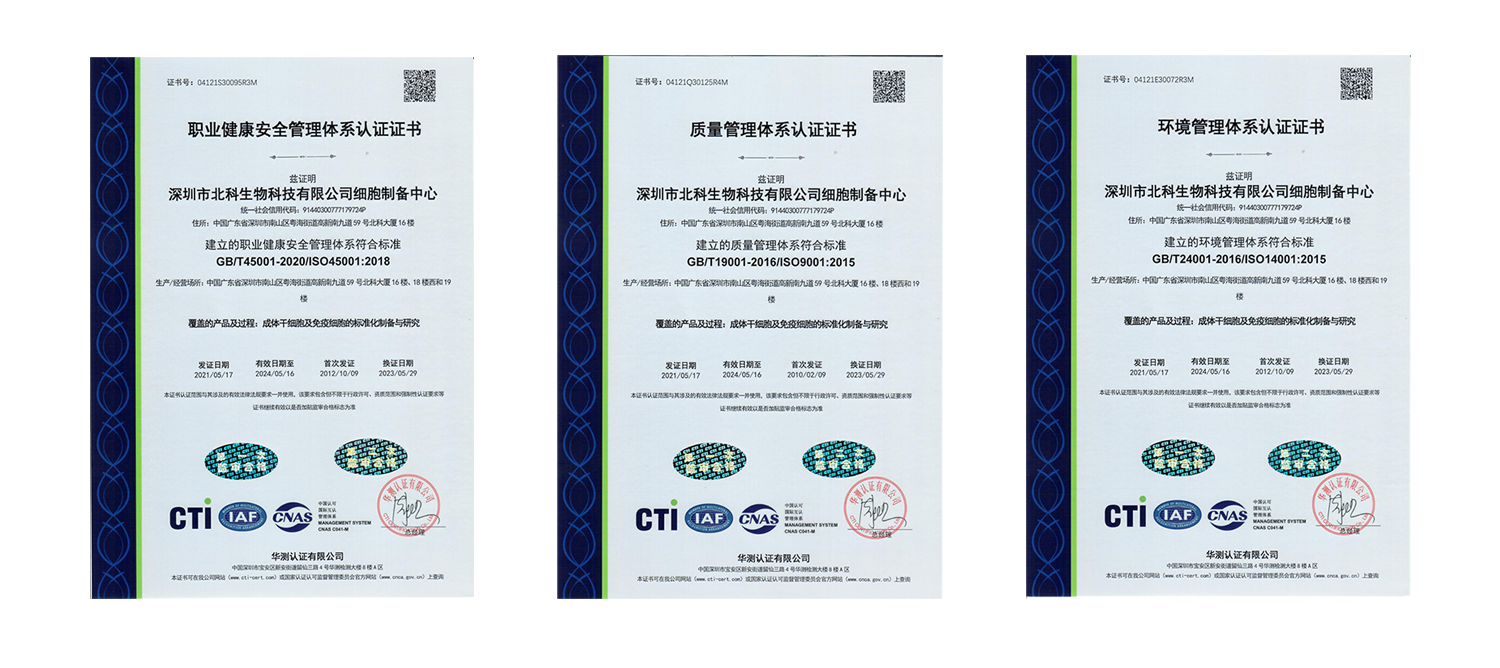 北科生物是國內(nèi)較早在細(xì)胞生物醫(yī)藥領(lǐng)域引入質(zhì)量管理概念的企業(yè),于2010年首次進(jìn)行了ISO9001質(zhì)量管理體系認(rèn)證,并于2012年整合體系完成“質(zhì)量、環(huán)境、職業(yè)健康安全”三標(biāo)一體認(rèn)證。同時(shí)北科生物江蘇分公司是中國大陸首家引入并通過“血液和生物治療發(fā)展協(xié)會(huì)”((Association for the Advancement of Blood & Biotherapies,簡(jiǎn)稱AABB,原美國血庫協(xié)會(huì))認(rèn)證的綜合性細(xì)胞庫。2017年5月,北科生物深圳細(xì)胞庫(深圳綜合細(xì)胞庫)的四項(xiàng)自體細(xì)胞(人臍帶來源間充質(zhì)干細(xì)胞、人臍血來源造血干細(xì)胞、人胎盤來源間充質(zhì)干細(xì)胞、人外周血免疫細(xì)胞)儲(chǔ)存應(yīng)用技術(shù)質(zhì)量管理體系同時(shí)通過AABB認(rèn)證,標(biāo)志著北科生物已經(jīng)建立起細(xì)胞制備、儲(chǔ)存及臨床轉(zhuǎn)化應(yīng)用服務(wù)的整合型技術(shù)管理模式。