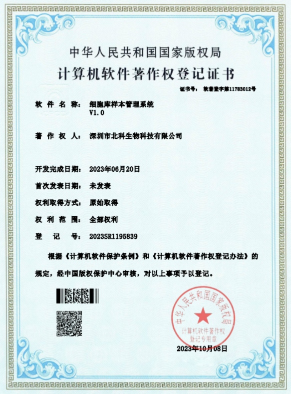 2023年10月8號,北科生物制備中心細(xì)胞庫團(tuán)隊(duì)自主研發(fā)軟件系統(tǒng)——”細(xì)胞庫樣本管理系統(tǒng)”通過國家版權(quán)局審核,獲得了《計(jì)算機(jī)軟件著作權(quán)登記證書》。該軟件系統(tǒng)分為8大核心模塊,通過軟件對在庫樣本從交接、