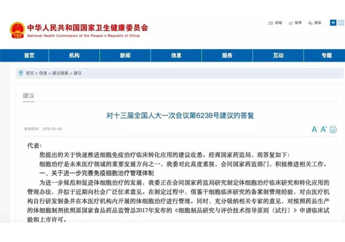 編者按:近日,國家衛(wèi)生健康委員會對十三屆全國人大一次會議第6238號建議給出答復(fù)。答復(fù)稱,國家衛(wèi)健委將會同藥監(jiān)部門,積極推進(jìn)細(xì)胞治療的相關(guān)工作。答復(fù)中還提到,“近期10余個細(xì)胞治療產(chǎn)品即將獲批開展臨床