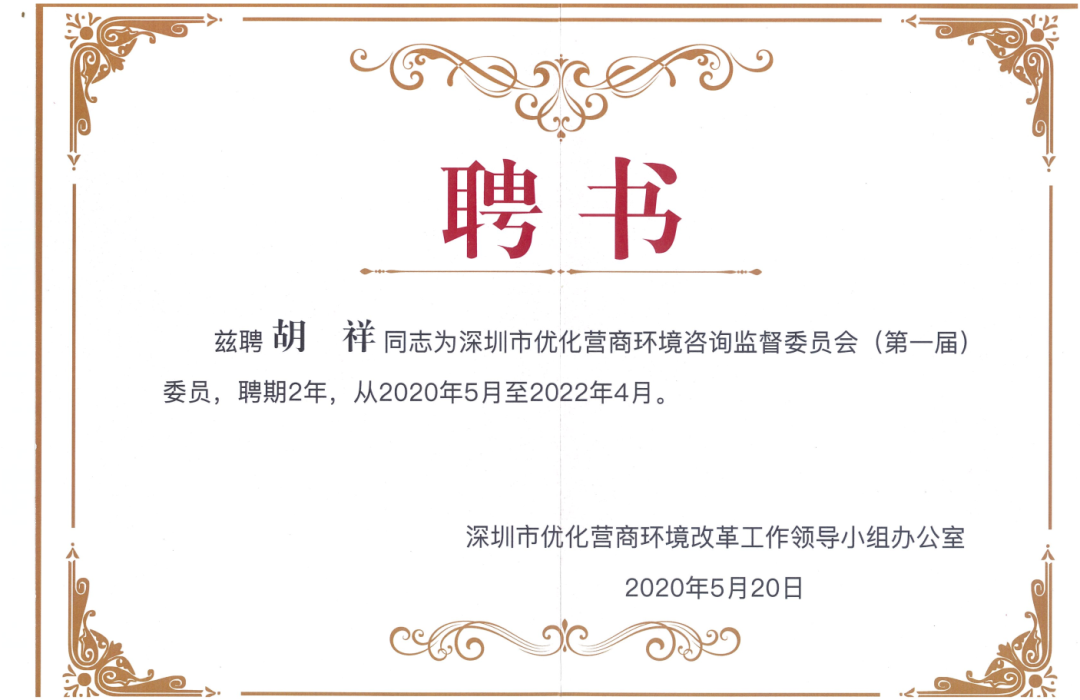 北科生物胡雋源博士受聘 “ 深圳市優(yōu)化營商環(huán)境咨詢監(jiān)督委員會 ” 副主任委員