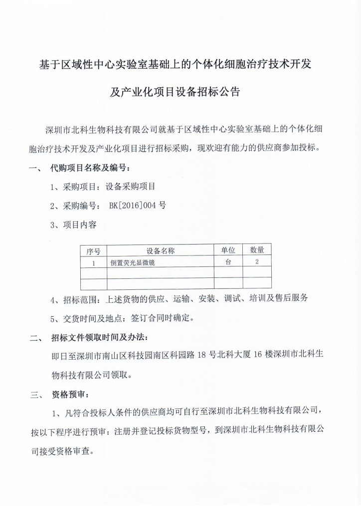 基于區(qū)域性中心實驗室基礎上的個體化細胞治療技術開發(fā)及產業(yè)化項目設備招標公告