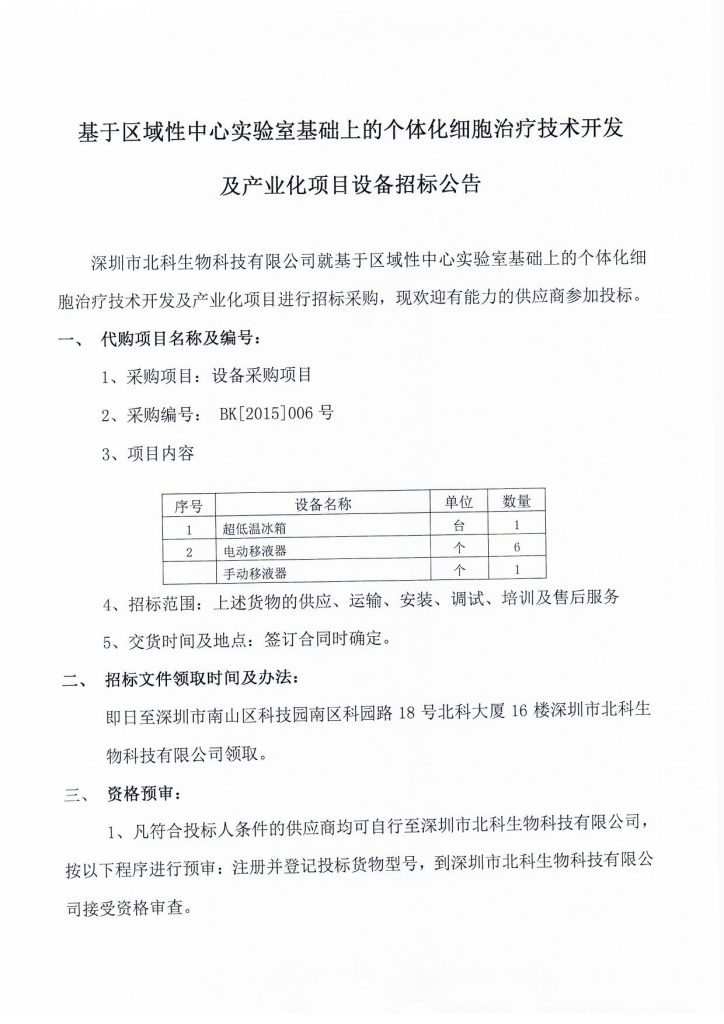 基于區(qū)域性中心實驗室基礎上的個體化細胞治療技術開發(fā)及產業(yè)化項目設備招標公告