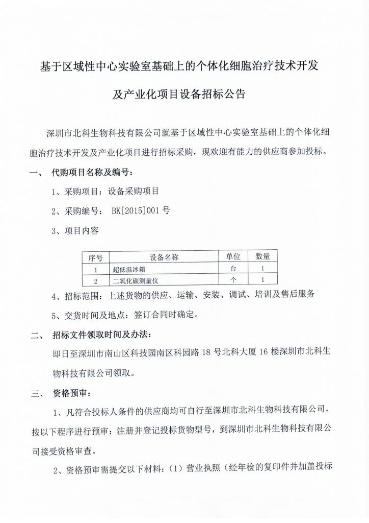基于區(qū)域性中心實驗室基礎(chǔ)上的個體化細(xì)胞治療技術(shù)開發(fā)及產(chǎn)業(yè)化項目設(shè)備招標(biāo)公告