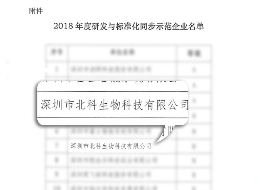 2019年02月20日,深圳市市場(chǎng)監(jiān)督管理局發(fā)布的深市監(jiān)[2019]41號(hào)文件,深圳市北科生物科技有限公司(以下簡(jiǎn)稱:北科生物)榮獲“研發(fā)與標(biāo)準(zhǔn)化同步示范企業(yè)”稱號(hào)。