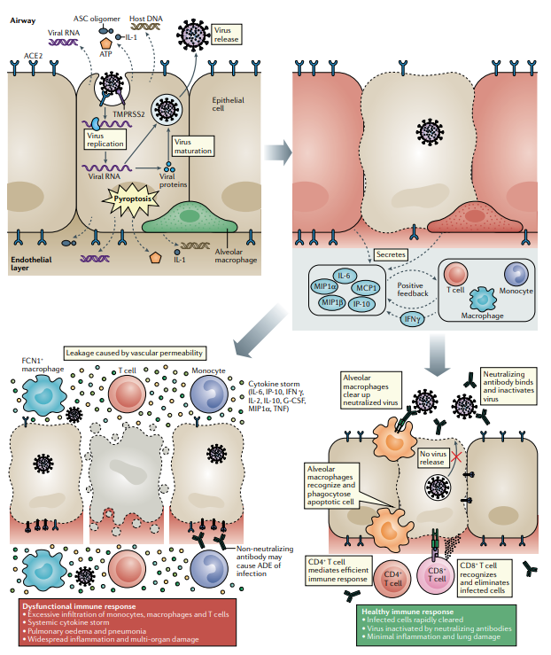 2019年底爆發(fā)的新型冠狀病毒,是一種人群普遍易感的病毒類型,以肺部病變?yōu)橹?,感染特征為發(fā)熱、干咳、氣促、肺部有炎癥性改變等。由于對新冠病毒感染缺乏有效的治療藥物,臨床主要依靠對癥支持治療為主,部分患者在肺炎進入進展期后,容易發(fā)生急性呼吸窘迫綜合征而危及生命。而由于自身免疫細胞識別并攻擊病毒,重癥患者體內(nèi)可能會誘發(fā)強烈的免疫反應,肺部出現(xiàn)多種且大量的炎癥細胞因子,體內(nèi)免疫平衡破壞,最終導致肺部器官嚴重損傷,出現(xiàn)嚴重的呼吸障礙(圖1)。